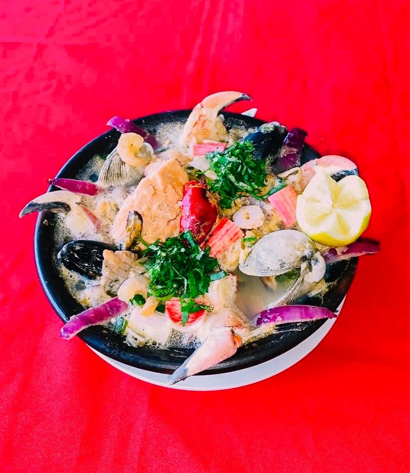 Caldo concentrado de mariscos y pescado del día, perfumado con vino blanco, ajo y cilantro. Servida en paila de greda, bien caliente.